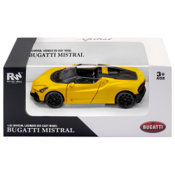 DIE-CAST kovový model auta angličák BUGATTI MISTRAL. Délka 10,5 cm. Oficiální licence. Věrná kopie interiéru, otevírací dveře, gumové pneumatiky, kola s volným pohybem. Vhodné pro kluky od 3 do 99 let.